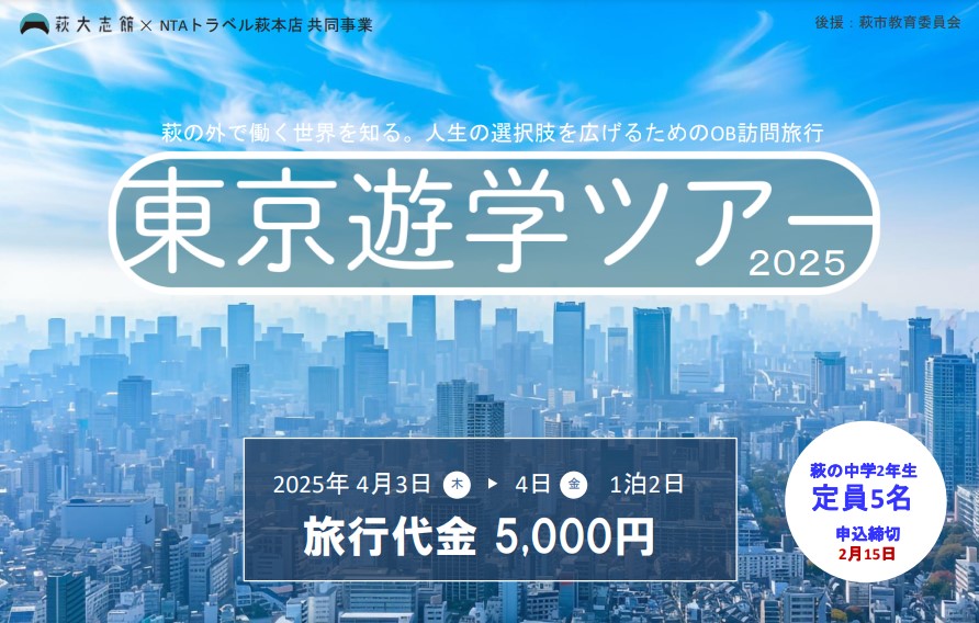 菊ヶ浜ライブカメラをはじめ、萩の中学2年生を1泊2日の東京OB訪問に招待する「東京遊学ツアー」など、萩大志館の活動は、萩出身の皆様の寄付だけで成り立っています。